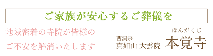 突然の葬儀や、初めての施主などご不安なことは多々あると思います。段取りや費用のこと、今後のお付き合いについてなど、ご家族のご事情を考慮しながらご相談やご提案をいたします。ご遠慮なく本覚寺までご連絡ください。