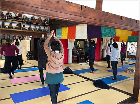 まずは本堂にマットやタオルを敷き、インストラクターから指導を受けて1時間ほど体をほぐします。